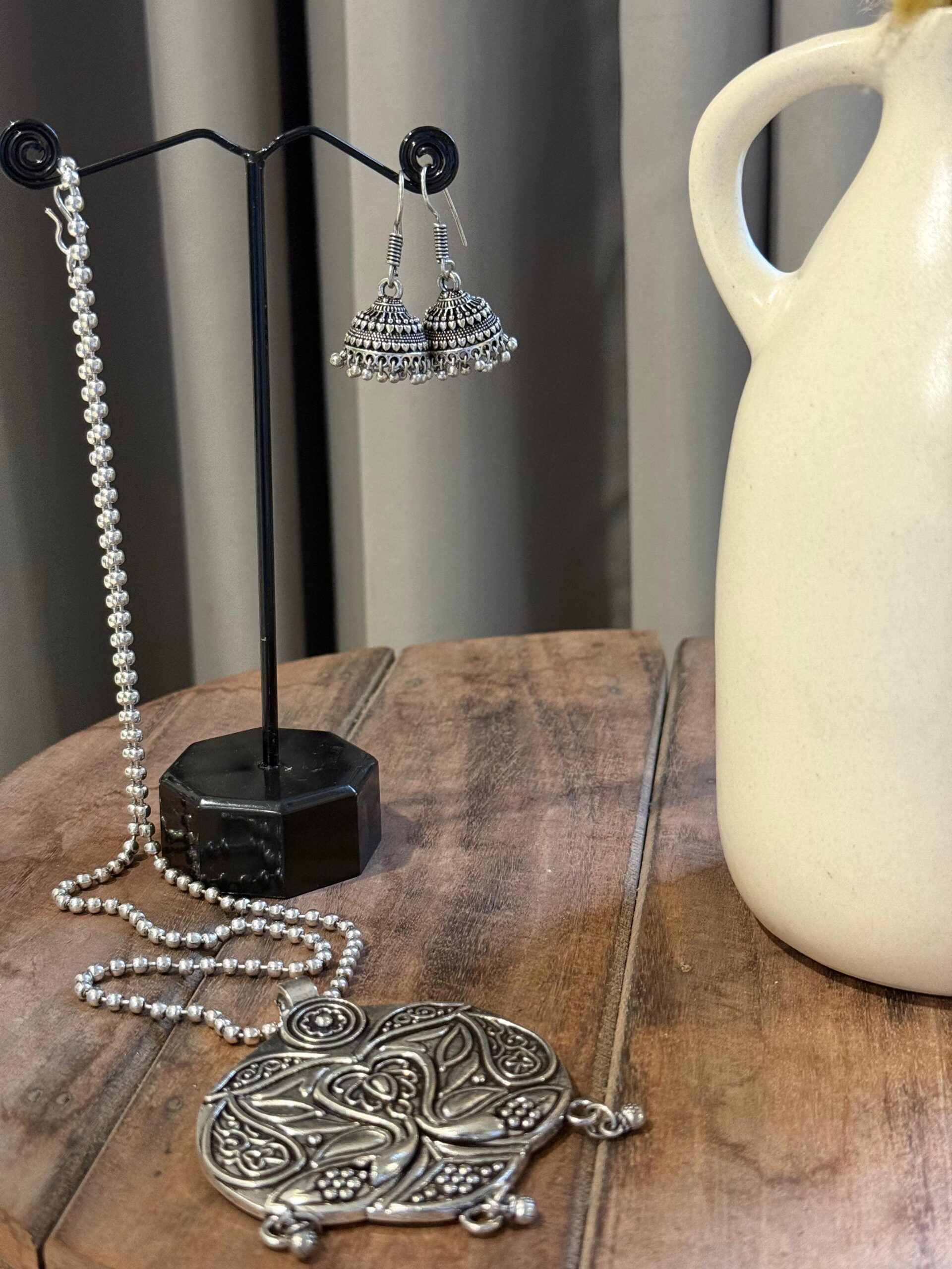 Care : Keep away from moisture, perfumes, lotions, and cleaning agents to preserve the oxidized finish. After use, gently wipe with a soft cloth and store separately in a dry pouch.