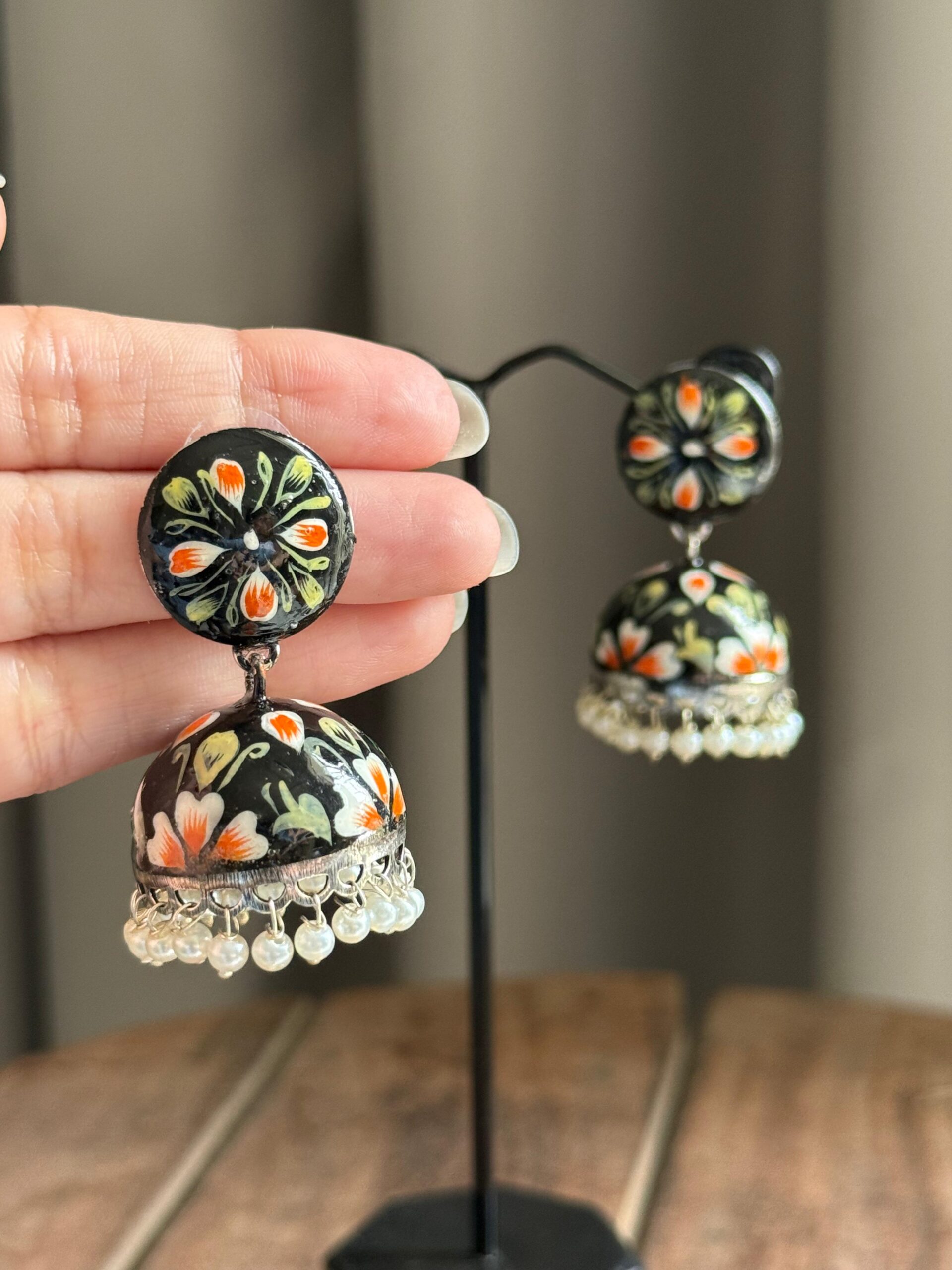 Make a bold yet graceful statement with these entirely hand-painted black jhumkas. This pair is a testament to traditional craftsmanship, featuring intricate brushwork and rich, deep tones that elevate any look. Lightweight and versatile, these earrings bring artistic charm to both ethnic and fusion outfits — perfect for festive occasions or adding flair to everyday style.