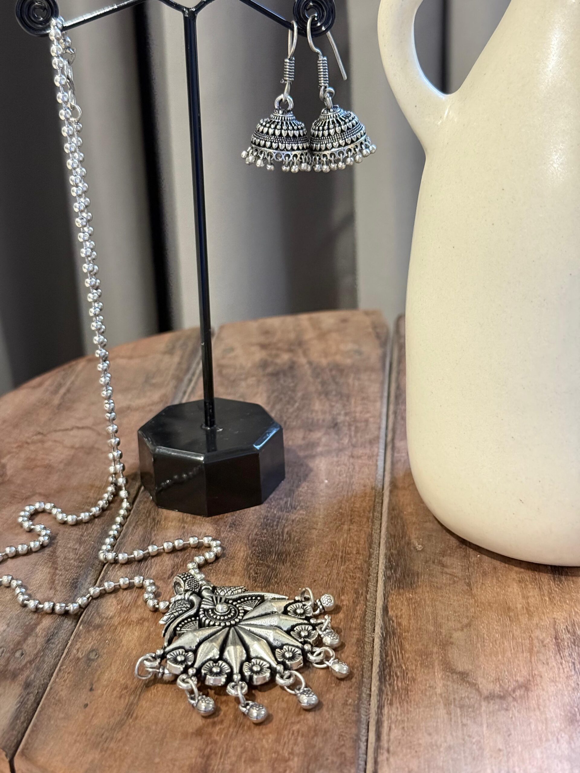 Crafted with intricate motifs, this long necklace effortlessly blends tradition with modern aesthetics—ideal to enhance your shine this Navratri. (With Earrings)