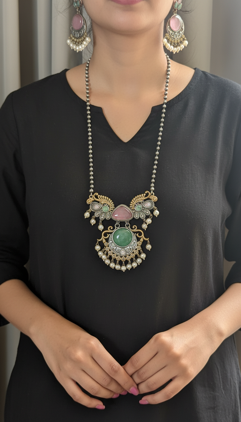 Crafted with intricate motifs, this long necklace effortlessly blends tradition with modern aesthetics—ideal to enhance your shine for every occasion.