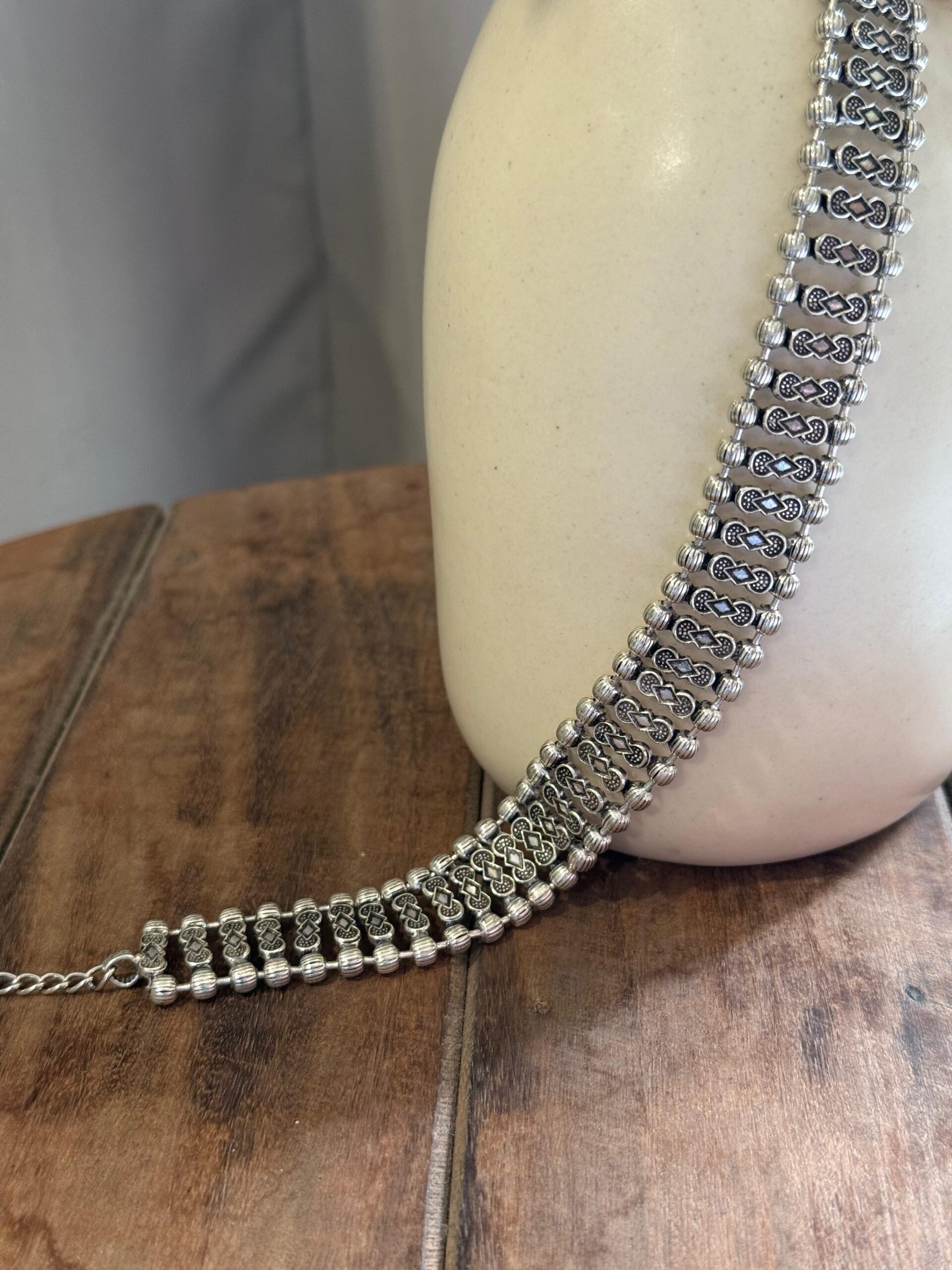 Care : Keep away from moisture, perfumes, lotions, and cleaning agents to preserve the oxidized finish. After use, gently wipe with a soft cloth and store separately in a dry pouch.